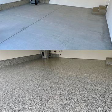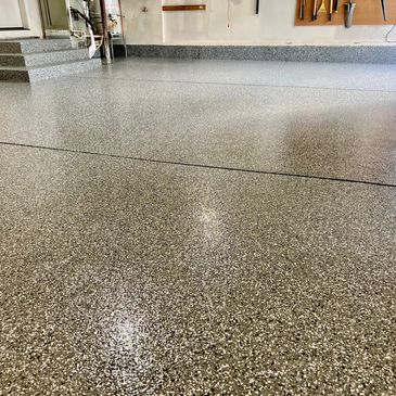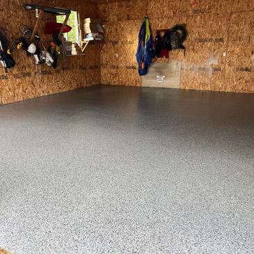 Shop in Molalla, OR - Granite chip application with a polyaspartic topcoat. Night fall was chip color choice.
